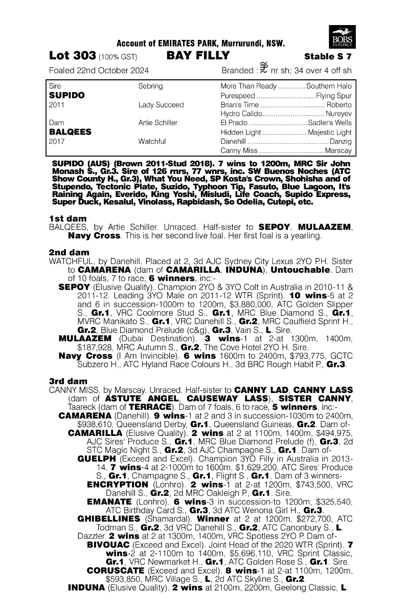 1200mまでのスプリントで7勝。MRC Sir John Monash S(G3)など重賞勝ち。2025年種付け料は9900ドル。